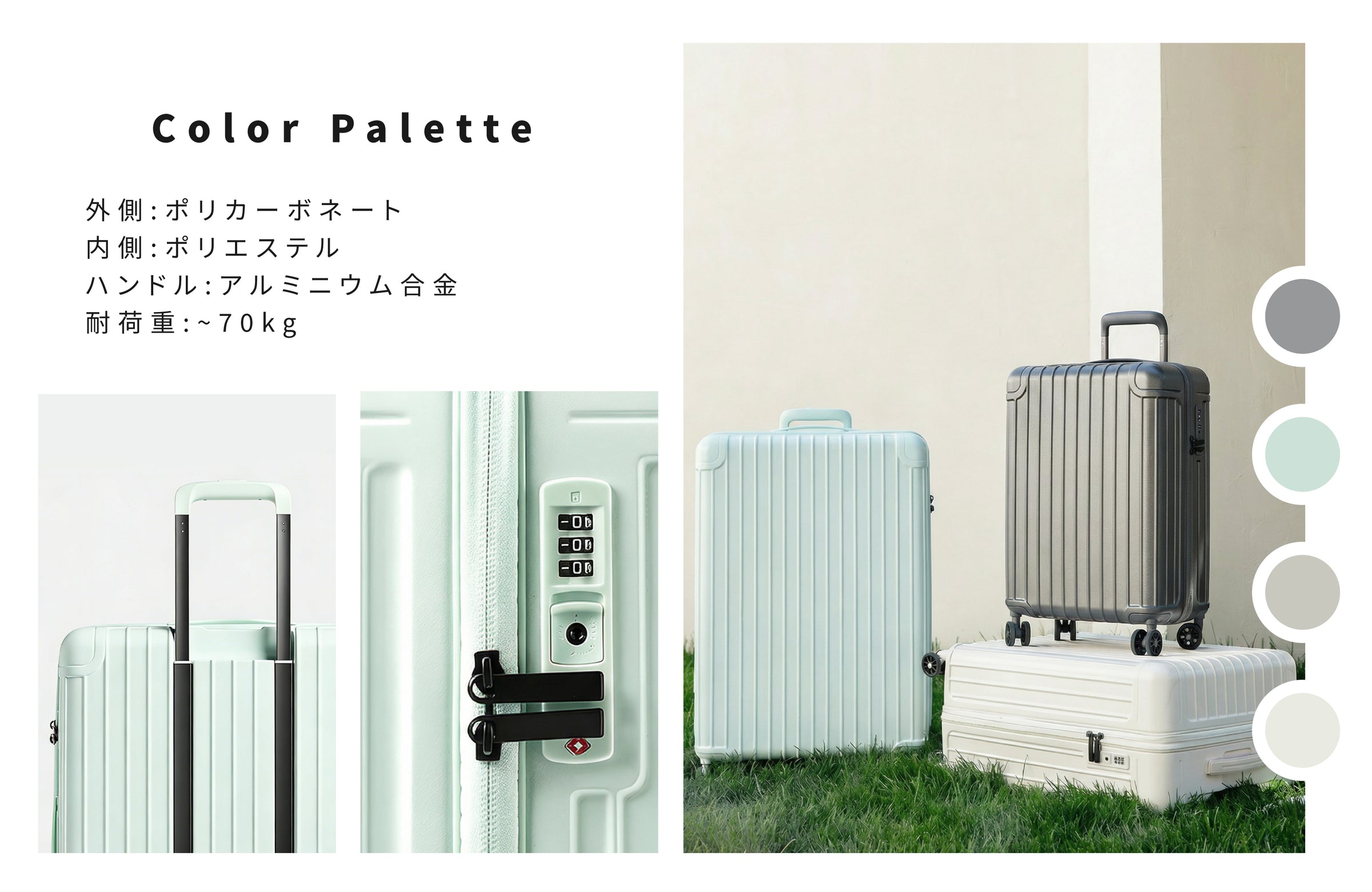 垂直方向に走るリブラインが軽快な印象を与える、実用性に特化したスタンダードモデルです。操作性の高いキャスターと軽量ボディの組み合わせにより、長距離の移動でもストレスのない、スムーズな走行体験を実現します。爽やかなミントグリーンやクリーンなホワイト、落ち着いたグレーなど、多彩なカラーバリエーションが魅力です。耐久性と軽やかさを求めるアクティブなビジネスパーソンにとって、日々の移動を支える最適なパートナーとなるでしょう。
