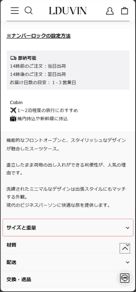 商品詳細ページにある「サイズと重量」ガイドを開く。